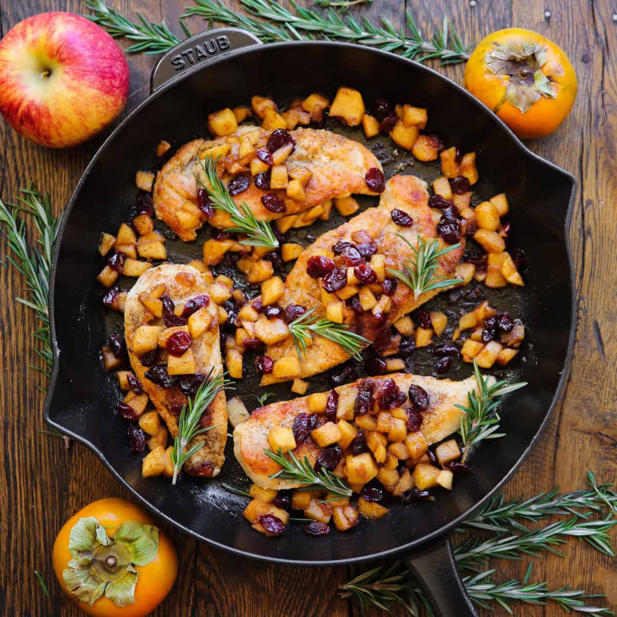 Meanwhile, in a separate pan, prepare the chicken. Lightly coat thinly sliced chicken breasts with flour, salt, and black pepper, then pan-sear them in olive oil until golden. To serve, spoon the apple-cranberry-cinnamon-honey sauce/glaze over the chicken. I do not doubt that this easy, 30-minute, restaurant-quality dinner will become your new family favorite, just like it happened in our household! And if you love this recipe style, don’t miss my delicious chicken with apples and maple-lime sauce.