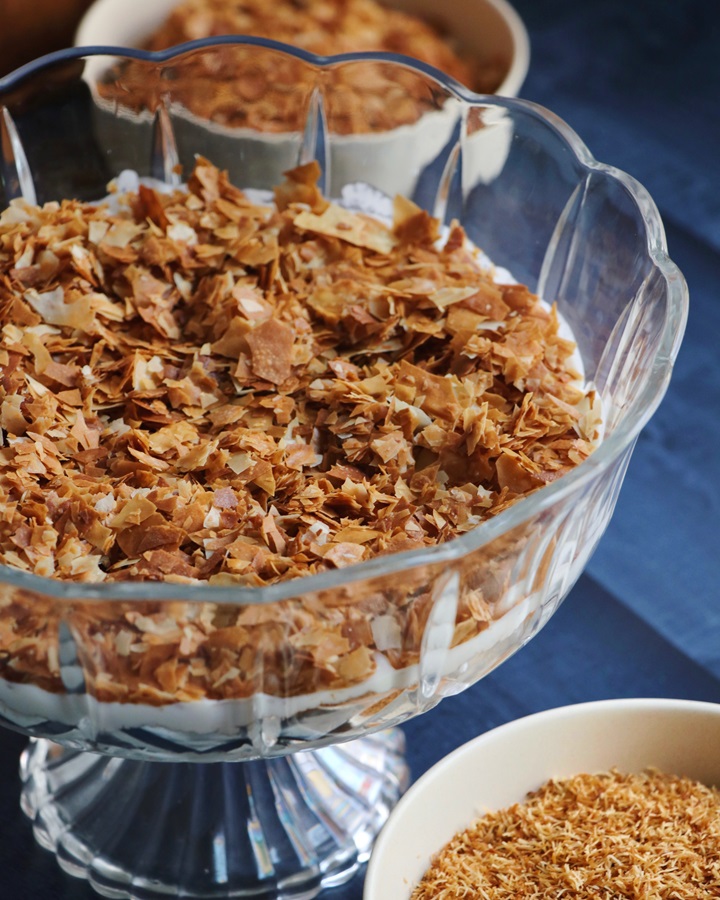 I liked serving it in glass dishes, simply because I felt the layers looked pretty but you can use any dessert bowls or serving trays of your choice. You can make 2 or 3 large dishes with this recipe. If you don’t want a large batch feel free to cut this recipe into half.
