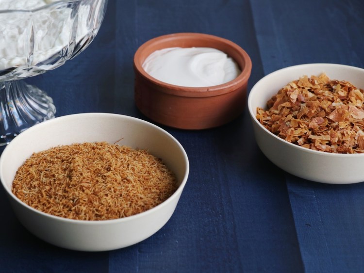 - Phyllo/Baklava sheets that are initially spread with a thin layer of butter/ghee, then baked until golden brown. These sheets are then crumbled into smaller flaky bits.