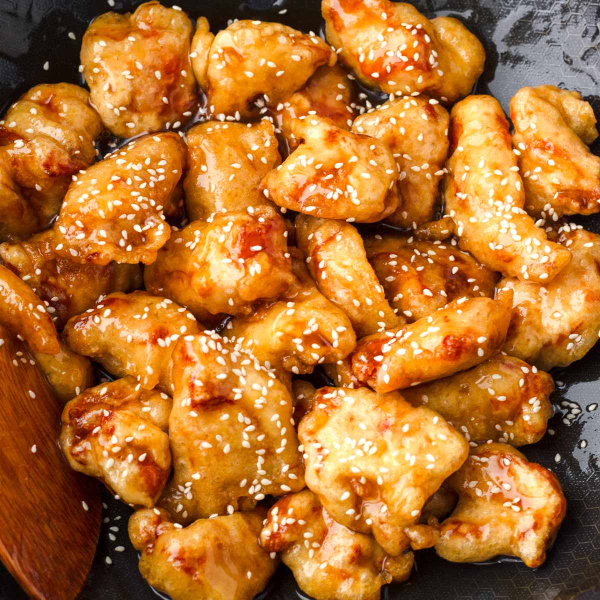 Add the crispy chicken back and toss with sauce to coat evenly. Garnish with sesame seeds and sliced scallions. Enjoy!