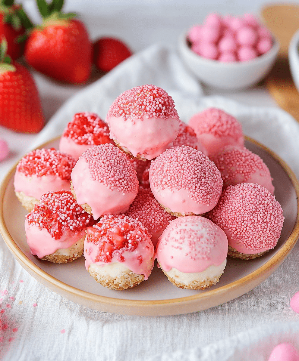 The first time I made these, it was for a last-minute girls’ night. I needed something impressive but effortless. I had cream cheese, a box of strawberry cake mix, and some leftover almond bark from holiday baking. A little experimenting later, and these dreamy, creamy bites were born. They disappeared within minutes, and I knew I had found a keeper.
