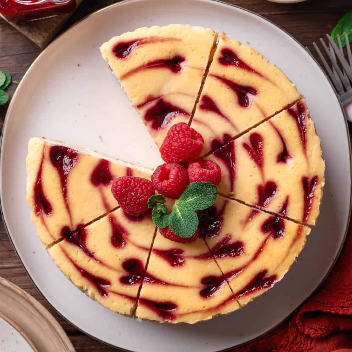 - The perfect balance of sweet and tart. My raspberry cheesecake is a family favorite because we’re not fans of desserts that are sugar bombs. The contrast between the sweet, velvety cream cheese filling and the tart berries strikes just the right balance!