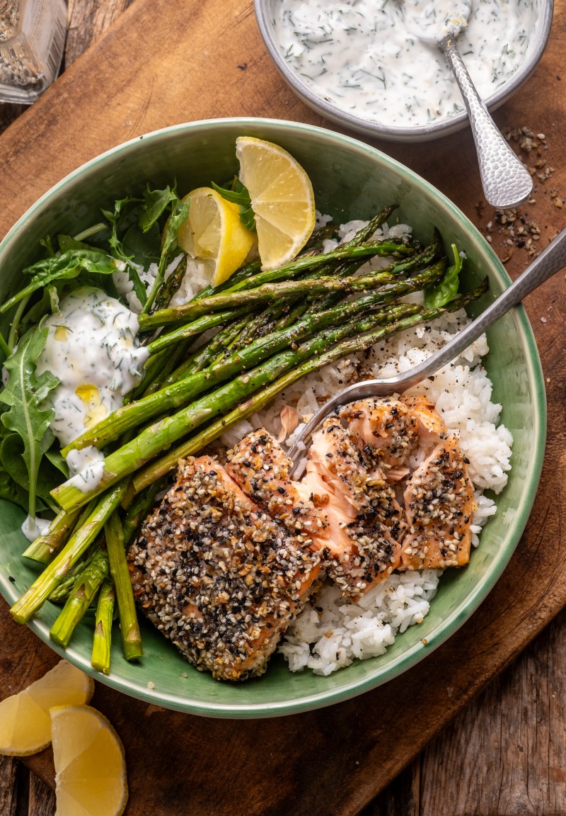 Sheet Pan everything salmon and asparagus…the salmon is coated with everything bagel seasoning and roasted on a sheet pan alongside fresh asparagus spears. Serve with a lemon dill yogurt sauce and rice for a super simple 20-minute dinner.