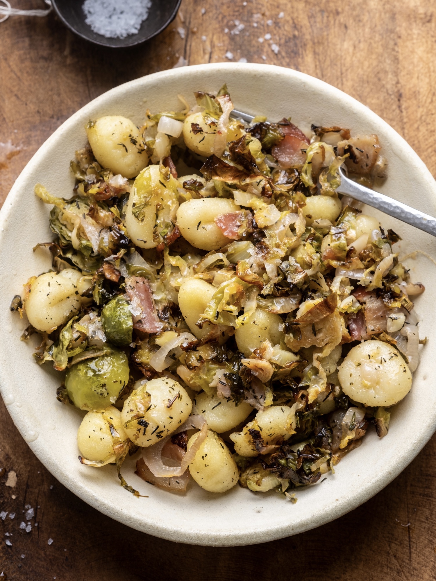 Bake in the oven on a center or lower rack for about 40 minutes, tossing with a spatula every 15 minutes or so. The bacon fat should render as it crisps and help the brussel sprouts and shallots caramelize. You’ll know the gnocchi is ready when it’s crisp on the inside but still soft on the inside.
