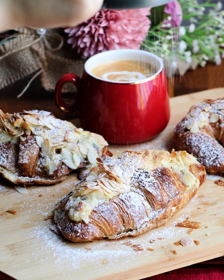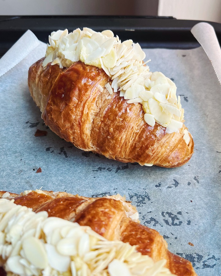 The process of turning regular croissants into almond croissants is very simple. Slice them in half and then fill it up with the Almond cream or Frangipane. Then, add a little more almond cream on top along with some sliced almonds. Bake, dust it off with icing sugar and it’s ready to eat!